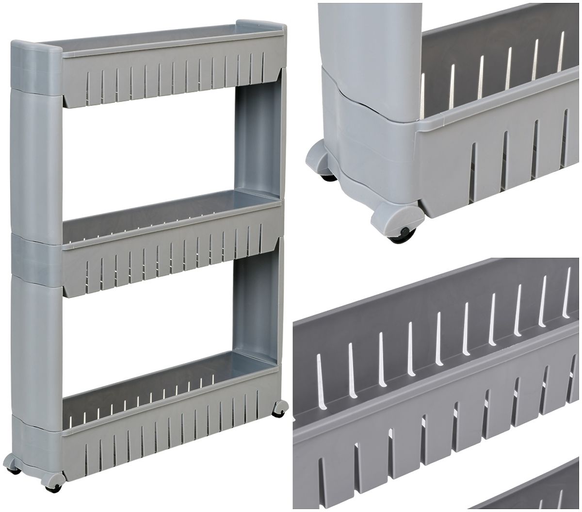 Mobil szekrény ideális keskeny helyekre, mint például a konyha vagy a fürdőszoba. Moduláris kialakítása tartós műanyagból készült, amely lehetővé teszi az igényekhez való könnyű alkalmazkodást – a polcok hozzáadhatók vagy eltávolíthatók. Kompakt méreteinek köszönhetően remekül illeszkedik a szekrény és a hűtőszekrény, a mosógép vagy más nehezen hozzáférhető helyek közé. A konyhai polc ideális fűszerek, konyhai kiegészítők, kozmetikumok, tisztítószerek és sok más szükséglet tárolására. Négy kerék biztosítja a mobilitást, így a fürdőszobai szekrény könnyen áthelyezhető oda, ahol szükség van rá.