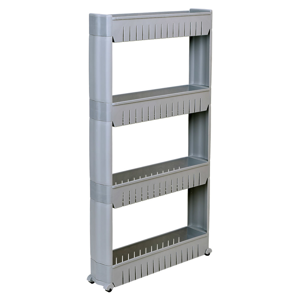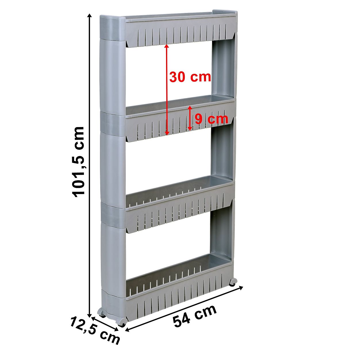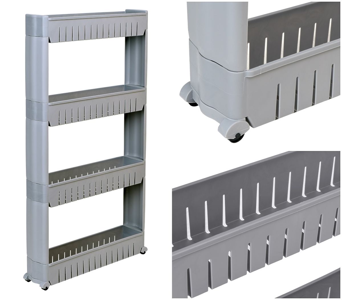 Mobilis szekrény, amely ideális keskeny helyekre, mint például konyha vagy fürdőszoba. Moduláris kialakítása tartós műanyagból készült, amely lehetővé teszi a könnyű testreszabást – a polcok hozzáadhatók vagy eltávolíthatók. Kompakt méretei miatt remekül illeszkedik a szekrény és a hűtőszekrény, mosógép vagy más nehezen hozzáférhető helyek közé. A konyhai polc kiválóan alkalmas fűszerek, konyhai kiegészítők, kozmetikumok, tisztítószerek és sok más szükséges dolog tárolására. Négy kerék biztosítja a mobilitást, így a fürdőszobai szekrény könnyen mozgatható oda, ahol szükség van rá.