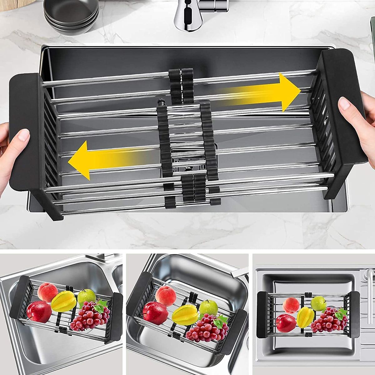 Praktikus és univerzális csepegtető zöldségek és gyümölcsök számára. Erős műanyagból és rozsdamentes acélból készült. Korrózióálló és nagyon tartós. A teleszkópos kialakítás lehetővé teszi a mosogató kívánt méretéhez való igazítást. A kosár 28 cm-től 43 cm-ig állítható.