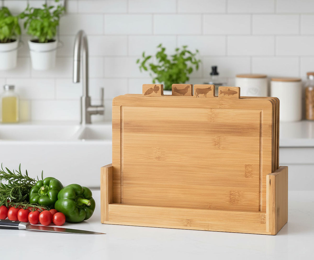A Dorri bambusz vágódeszka készlet kiváló választás mindazok számára, akik értékelik a higiéniát és a praktikusságot a konyhában. Minden deszka kifejezetten egy adott típusú termék előkészítésére lett tervezve, ami biztosítja az ízek és aromák teljes elkülönítését, valamint minimalizálja a keresztfertőzés kockázatát. A deszkákon elhelyezett jelöléseknek köszönhetően könnyen felismerhetők és rendeltetésszerűen használhatók. A készlet tartalmaz egy ugyanabból a tartós bambuszból készült állványt, mint a deszkák, ami lehetővé teszi a könnyű tárolást és a gyors hozzáférést. A bambuszfa környezetbarát és egészségre biztonságos anyag, ami ideális megoldás azok számára, akik értékelik a természetes termékeket. Válassza a Dorri bambusz vágódeszka készletet, és gondoskodjon a higiéniáról és praktikusságról a konyhájában!
