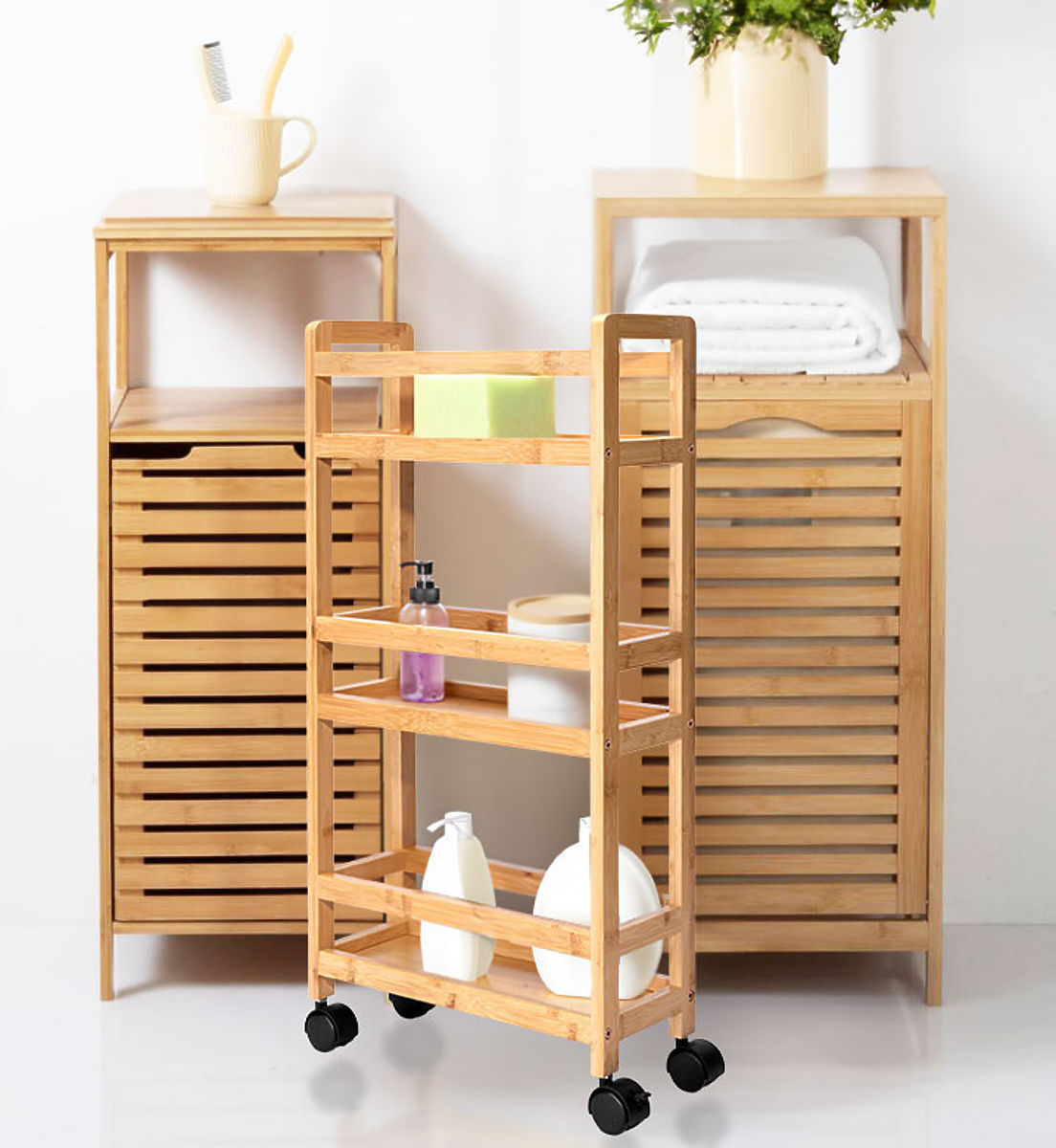 Fedezze fel a tökéletes tárolási megoldást konyhájában vagy fürdőszobájában az INAKI bambusz polccal. Az eleganciát a funkcionalitással ötvözve, természetes bambuszból készült, ez a háromszintes polc tartósságot és stílust biztosít, amely bármely belső térhez illik.
