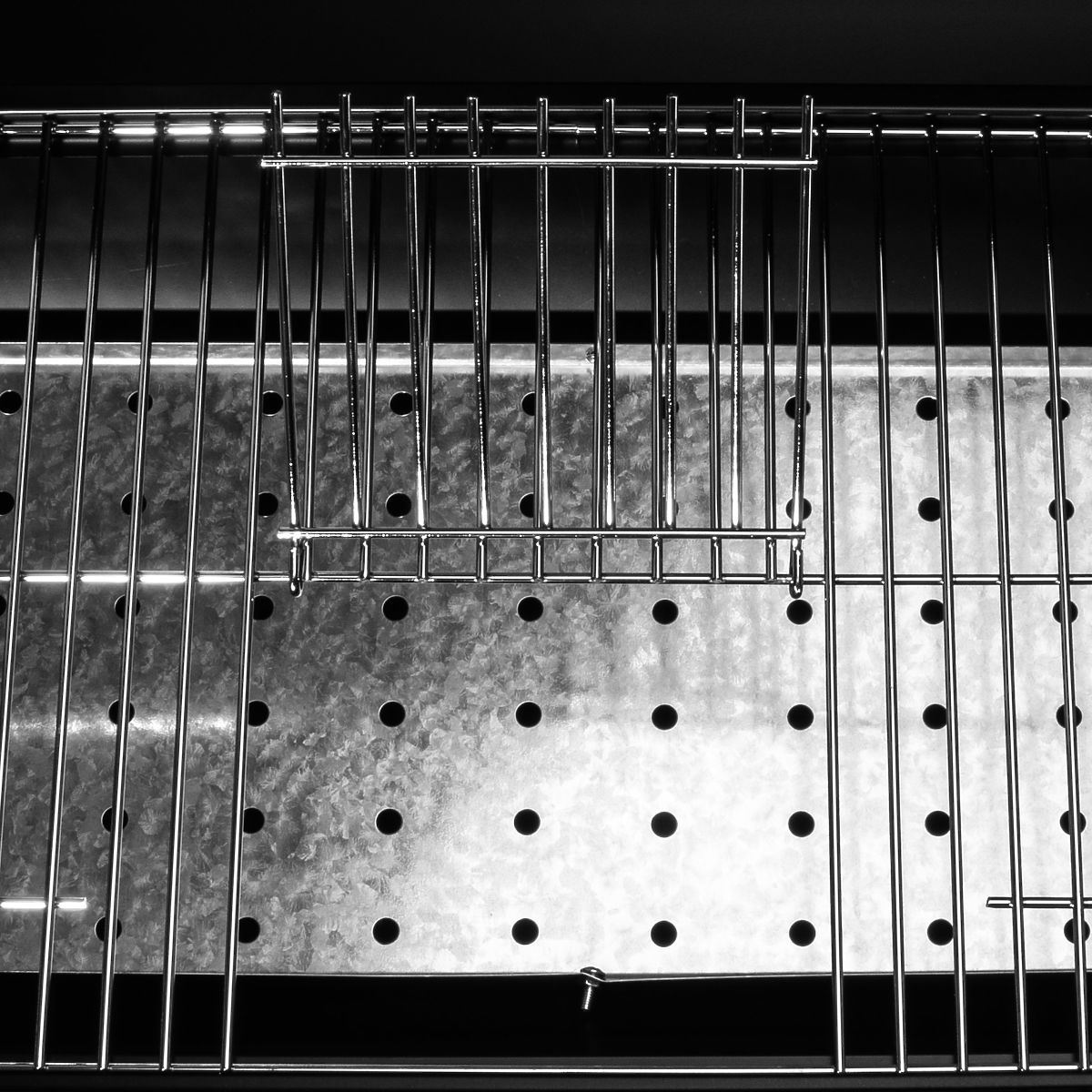 ✔️Két rács: 70 x 35 cm és 67 x 13 cm | ✔️Beépített hőmérő | ✔️Két összecsukható polc | ✔️Hamutartó a készletben |