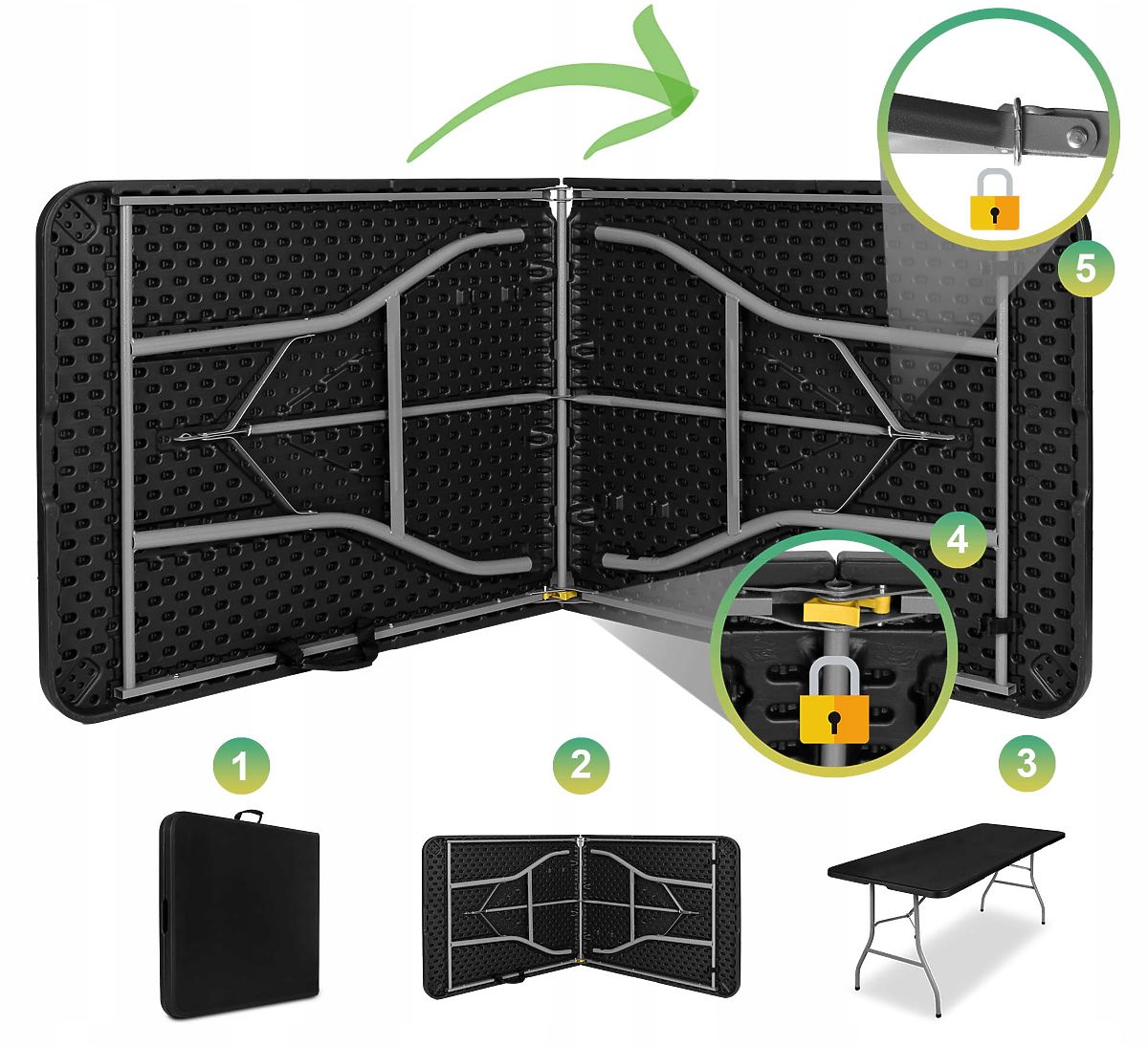 Ez a catering készlet, amely egy 180 cm hosszú összecsukható asztalt és 6 összecsukható széket tartalmaz, ideális különféle eseményekhez. Az acél porfestett szerkezet biztosítja a szilárdságot, míg a HDPE anyagból készült asztallap és ülések ellenállnak a sérüléseknek. Az asztal és a székek könnyen szállíthatók – az asztal praktikus fogantyúval, a székek pedig a háttámlán lévő nyílással rendelkeznek, ami megkönnyíti a szállítást. Az egész készlet időjárásálló, és a lábakon található csúszásmentes talpak biztosítják a stabilitást.